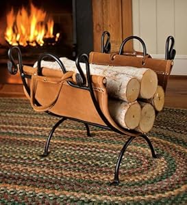 Product DescriptionHere's a sensible - and beautiful - way to tote and store your firewood. Load you logs into the suede sling, bring them inside, then store the loaded sling on the wrought iron rack - you transfer the logs only once! Forged, wrought iron rack has classic shepherd's crook styling finished with lovely grooved beavertail ends. The sueded top-grain cowhide sling keeps bark and dirt off your floor. All seams are double sewn and riveted for strength. Rack folds for off-season storage. Suede sling also available separately. Imported. Makes a great hearth gift! Size Rack 15"L x 24"W x 19"H Sling 17"L x 29"W