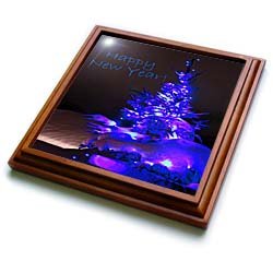 Product Description : : Size: 8x8 Trivet with 6x6 ceramic tilePretty Christmas Tree Happy New Year in Royal Blue With Blue Text Trivet is measuring 8w x 8h x .75d. Made of solid wood with padding on back that protects your furniture. Framed trivet comes with 6w x 6h ceramic gloss tile attached to the wood frame.