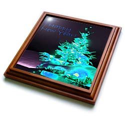 Product Description : Size: 8x8 Trivet with 6x6 ceramic tilePretty Christmas Tree Happy New Year in Ice Blue With Blue Text Trivet is measuring 8w x 8h x .75d. Made of solid wood with padding on back that protects your furniture. Framed trivet comes with 6w x 6h ceramic gloss tile attached to the wood frame.