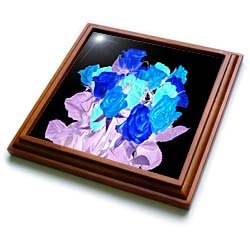 Product Description : Size: 8x8 Trivet with 6x6 ceramic tileIridescent Blue Rose Bouquet on Black Trivet is measuring 8w x 8h x .75d. Made of solid wood with padding on back that protects your furniture. Framed trivet comes with 6w x 6h ceramic gloss tile attached to the wood frame.