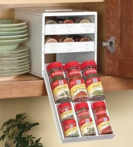 Product Description : Youcopia Spicestack- 18100- Spicestack allows you to save valuable countertop and drawer space by cleverly storing 18 full-size spice bottles in your cabinet. Save time by staying organized! Three unique drawers pull out and lower to resting position, displaying spice bottles at eye-level for easy selection and return while cooking. SpiceStack is made of high-impact, durable plastic and wipes clean with a damp cloth. Includes 96 outside drawer labels for the ultimate custom spice rack. Spices not included. No assembly required.