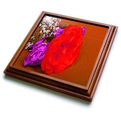 Product Description : Size: 8x8 Trivet with 6x6 ceramic tileRed Purple Bouquet Trivet is measuring 8w x 8h x .75d. Made of solid wood with padding on back that protects your furniture. Framed trivet comes with 6w x 6h ceramic gloss tile attached to the wood frame.