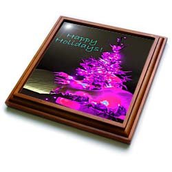 Product Description : : Size: 8x8 Trivet with 6x6 ceramic tilePretty Christmas Tree Happy Holidays in Pink With Light Blue Text Trivet is measuring 8w x 8h x .75d. Made of solid wood with padding on back that protects your furniture. Framed trivet comes with 6w x 6h ceramic gloss tile attached to the wood frame.